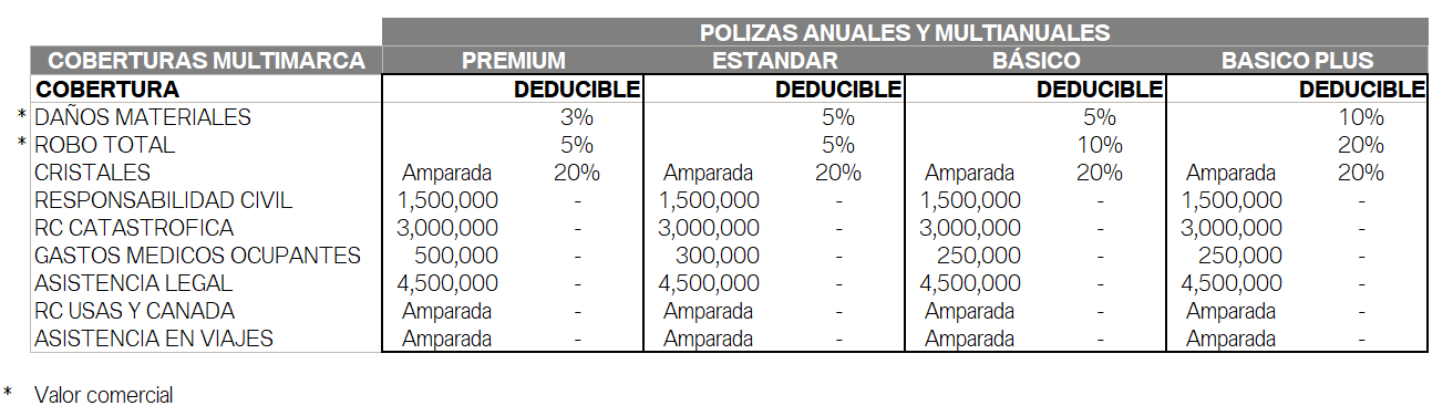 • Otorgamos sumas aseguradas a Valor de Reposición o Valor de Factura para las coberturas de Daños Materiales y Robo Total en unidades nuevas